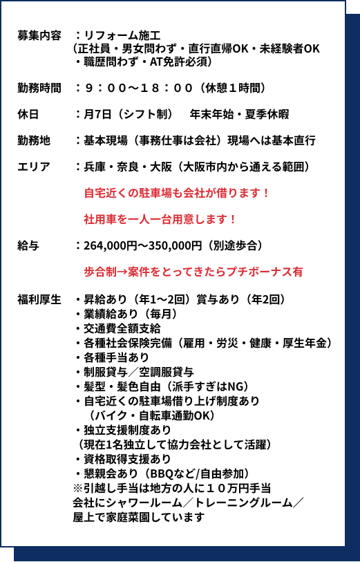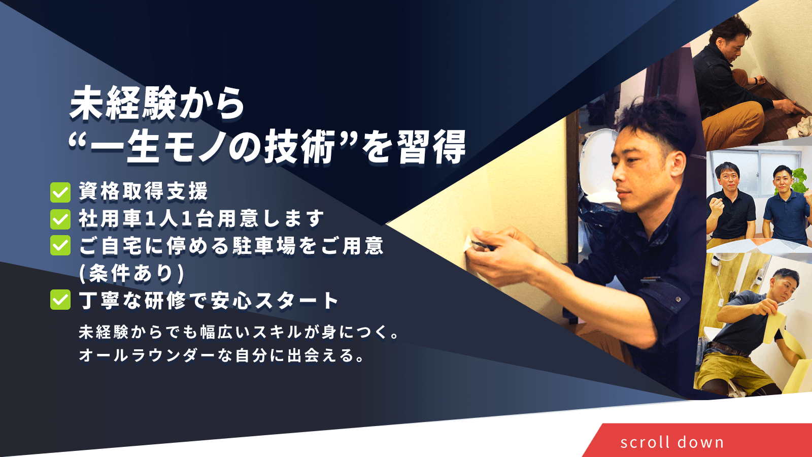 現場での施工だけでなく、現地調査やお客様対応、見積もり作成、リフォーム提案など、幅広い業務を経験できます。